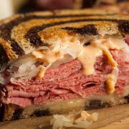 Bread grilled with butter and stuffed with corned beef, sauerkraut, melted Swiss cheese, and Ranch dressing with a dill pickle